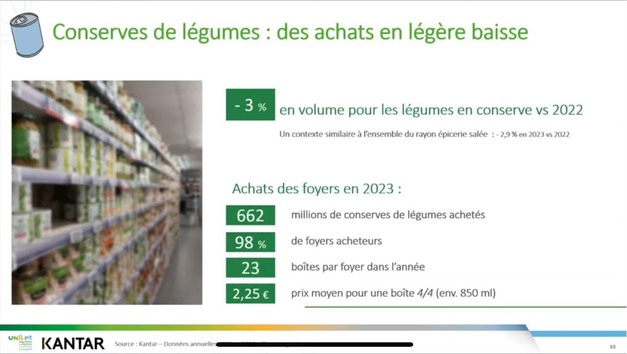 A pesar de esta buena imagen y de su creciente popularidad, las cifras muestran una muy ligera tendencia a la baja en 2023: -3% en volumen para las conservas y -2,4% para las congeladas. Para Nicolas Facon, vicepresidente de UNILET y presidente del grupo de hortalizas de FIAC, esta "ligera tendencia a la baja refleja la tendencia de los mercados de comestibles".