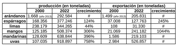 La mayor parte del crecimiento de la producción se debe a la expansión del área sembrada, pero en parte también al aumento del rendimiento por hectárea, que en el caso de las limas ha sido del 20% entre el 2000 y el 2022; en el caso de las paltas, del 28%; de los mangos, del 32%; de los espárragos, del 44%; de las mandarinas, del 75%; de las uvas, del 138%, y de los arándanos, incluso del 420%, siempre ateniéndonos a las cifras compartidas por Faostat.