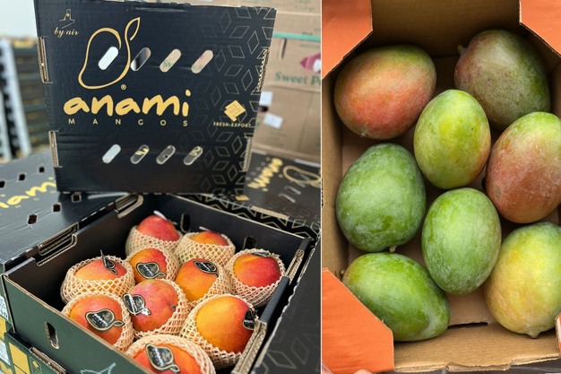 Izquierda: mangos Kent mexicanos transportados por avión. Derecha: mangos Keith de Santo Domingo.