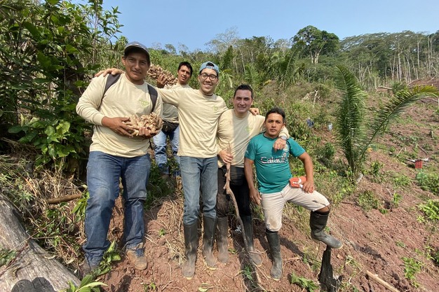 Cameron Mistal, en el centro, con un equipo que cosecha jengibre en la selva de Perú.
