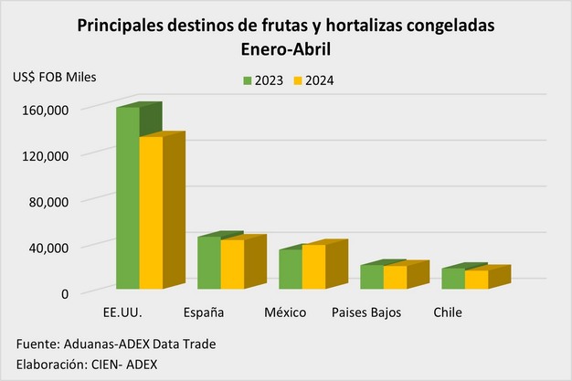 En el primer cuatrimestre del año, EE. UU. (US$ 132 millones 171 mil) se ubicó en el primer lugar del ranking de compradores al concentrar más del 35% del total gracias al TLC vigente desde el 1° de febrero del 2009. Demandó mangos, alcachofas, arándanos, palta, páprika y pimientos (congelados y en conserva).