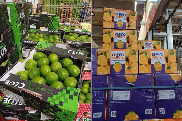 A la izquierda: limas Tahití de ultramar. Derecha: naranjas de zumo Valencia de origen egipcio.