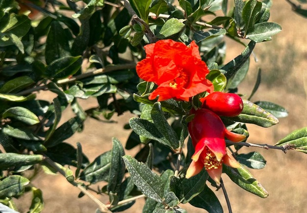 Flores y pequeños frutos de la variedad de granada Wonderful.
