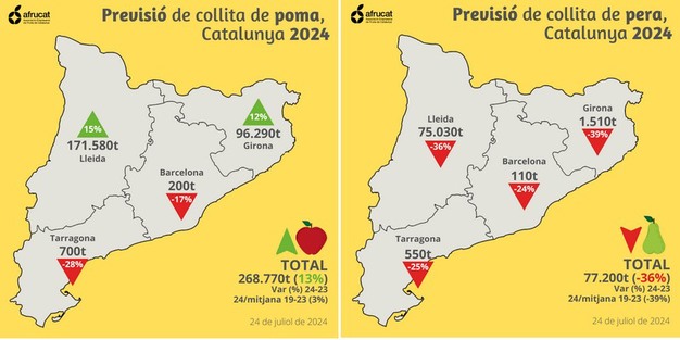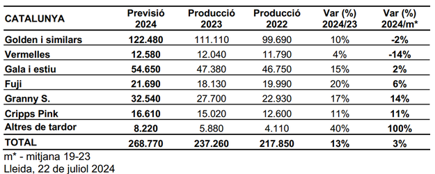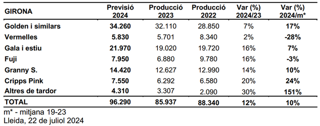 La producción de manzana de Girona (96.290t) se prevé un 10% superior a la media 19-23 y superior en un 12% en comparación con 2023.