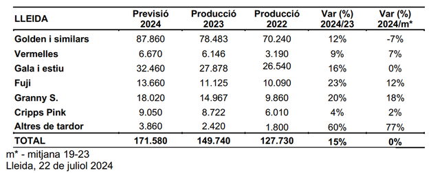 La previsión de producción de manzana en Lleida para 2024 (171.580 t) es similar a la media de los últimos 5 años y un +15% superior respecto al año pasado.