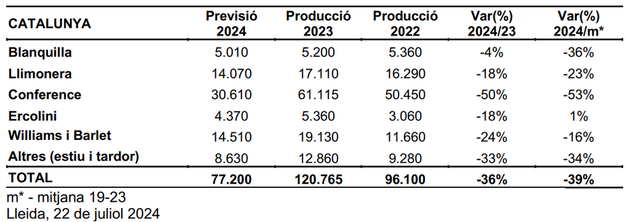 La previsión de cosecha de pera en Cataluña para 2024 (77.200t) se estima que sea inferior (- 39%) a la media de los últimos 5 años y un 36% menor que en 2023.