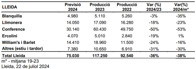 La previsión de cosecha de pera en Lleida para el 2024 (75.030 t) se estima que sea inferior a la mediana 19-23 (-38%) y un 36% inferior al 2023.