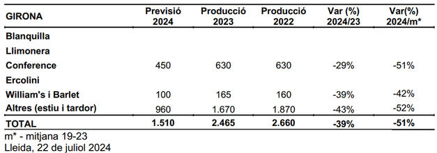 La previsión de cosecha de Girona para el 2024 (1.510t) es un 51% inferior a la mediana de los últimos 5 años y un 39% más baja que en 2023.
