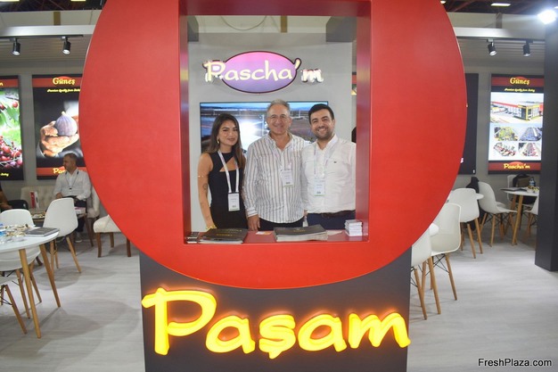 Melisa y Tufan Ünal y Furkan Mavi, del socio colaborador Pasam, en Interfresh Eurasia 2023.
