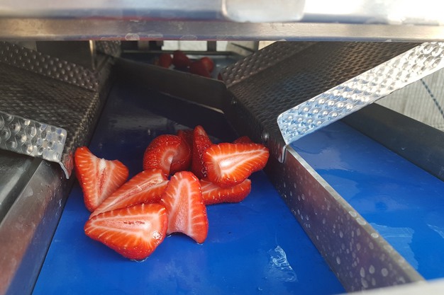 "La planta es capaz de calibrar en línea y procesar fresas de distintos tamaños y formas, con diámetros comprendidos entre 18 y 50 mm", explica el experto. "El proceso elimina la parte apical verde de la fresa y, si se solicita, las máquinas pueden cortar la fresa en mitades o cuartos, garantizando un rendimiento excelente y conservando la forma natural de la fruta". El procesamiento se realiza en tres fases: alineación del producto, extracción del pedúnculo y expulsión de la fruta (que puede coincidir con la fase de corte, si así lo solicita el cliente)".