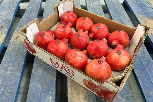 "Arrancamos en la semana 32 con la variedad Smith, cuando lo habitual es comenzar en la semana 34. Las olas de calor de este verano han hecho que la maduración de las granadas se acelere y empecemos a cosechar entre 10 y 12 días antes de lo normal", cuenta Francisco Mas, director comercial de Frutas y Hortalizas Mas Serrano, productora y exportadora de granadas con sede en Elche, Alicante.