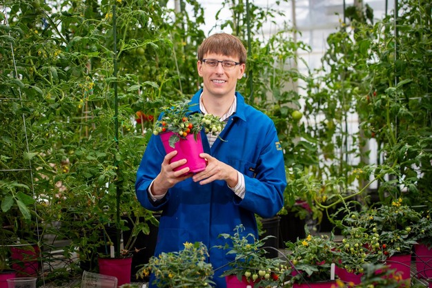El profesor asociado Robert Jinkerson muestra tomates espaciales en el invernadero. Foto: Stan Lim.