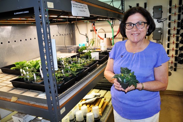 Martha Orozco-Cárdenas sostiene una planta de tomate en flor en el laboratorio. Foto: David Danelski.