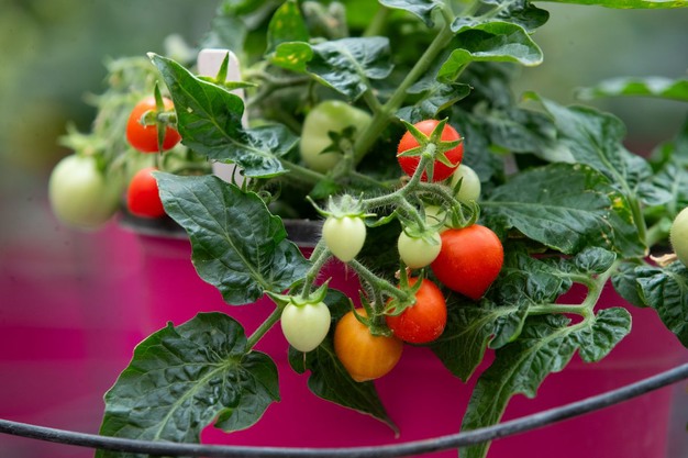 Planta con tomates espaciales maduros. Foto: Stan Lim.