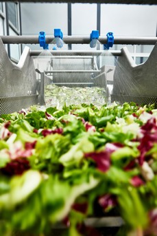 Un carrusel automático de cestas simplifica la manipulación y el traslado del producto lavado para su secado y envasado. Desde el sistema de secado, las mezclas de ensalada se transfieren a una pesadora de 2 cabezales, se pesan por porciones y se envasan con una envasadora de GKS Packaging B.V., socio de KRONEN.