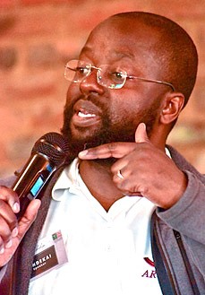 En las instalaciones de cuarentena del Consejo de Investigación Agrícola en Roodeplaat, a las afueras de Pretoria, se han inoculado plantas de banana con el virus para identificar qué genes vegetales muestran una mayor expresión debido a la infección, y lo que más destaca, observa el Dr. Tendekai Mahlanza (derecha), son los genes implicados en la replicación del ADN de la banana.