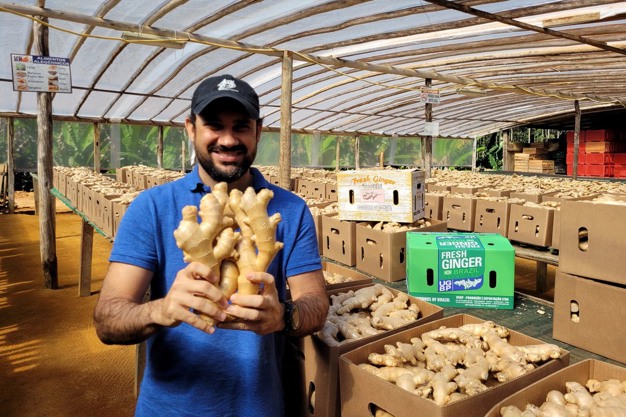 Fred Tavares muestra con orgullo el jengibre brasileño.