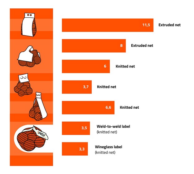 En el gráfico siguiente puede verse una comparación, para un envase de 500 gramos (por ejemplo, de limones), entre el peso del P-Pack y el de las principales mallas termoselladas (para frutos secos, cítricos, cebollas, patatas, etc.) que existen actualmente en el mercado.