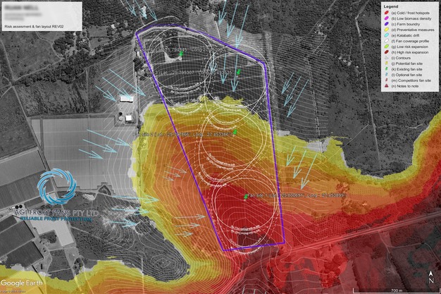 AGI Frost Fans sigue un modelo de evaluación de riesgos que tiene en cuenta la topografía, así como datos de biomasa a través de imágenes por satélite y análisis de flujo frío.