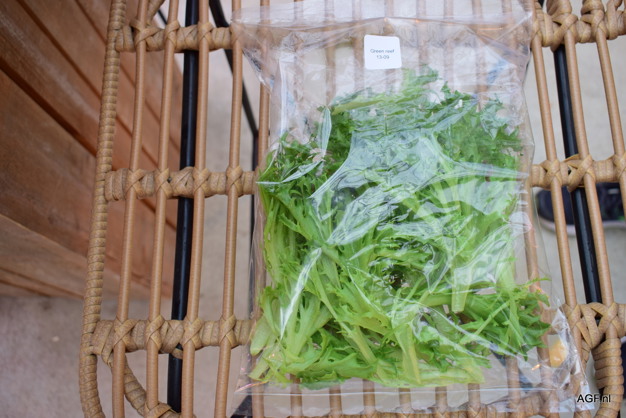 Cultivo eficaz de mezclas de lechugas. A la izquierda, la brassica rapa de sabor picante que puede mezclarse inmediatamente tras la cosecha con las variedades de lechuga de hoja pigmentada y multiforme que ya se han mezclado durante la siembra.