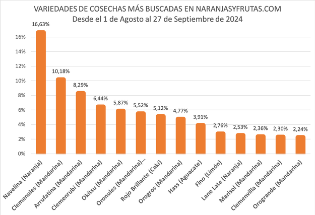 Desde esta plataforma y con el objetivo de compartir con el sector las tendencias de búsquedas de los comercios para localizar cosechas disponibles, Juan José Bas, gerente de Naranjasyfrutas.com explica: "Hemos realizado un pequeño resumen de las 14 variedades más buscadas desde el 1 de agosto hasta el 27 de septiembre de 2024. Los resultados obtenidos por variedades son, por orden: Navelina, Clemenules, Arrufatina, Clemenrubí, Okitsu, Oronules, Rojo Brillante, Orogros, Hass, Fino, Lane Late, Marisol, Clemenvilla y Orogrande".