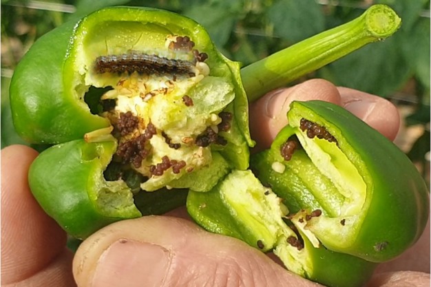 "En nuestro caso, tenemos una plantación de 44 hectáreas en la que plantamos pimiento California para la campaña de verano; se trasplantan en diciembre y recolectamos de marzo a septiembre. Estamos especializados en las variedades de california Wonder que producimos en sus 4 colores en hidropónico, y esta es una de las causas de la plaga que hemos tenido", explica Victoria Madrid, gerente de la SAT 9836/MU Agricultura y Exportación, "porque el sustrato de coco en el que cultivamos supone un hábitat muy confortable para las crisálidas de Heliothis".