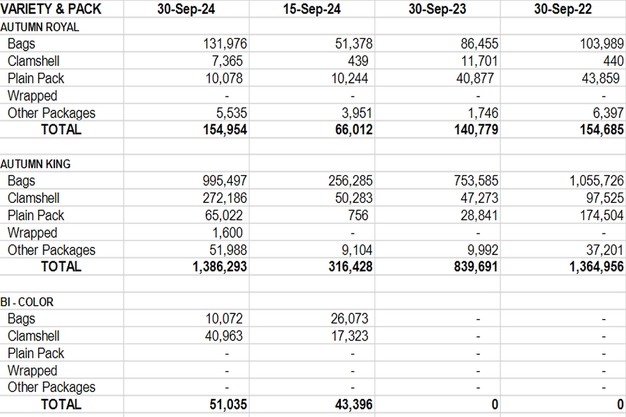 Entre el 15 de septiembre y el 30 de septiembre de 2024, se produjo una notable escalada en las existencias en cámaras frigoríficas de la variedad de uva Autumn King en Estados Unidos, al pasar de 316.428 envases a 1.386.293 envases, frente a los 839.691 de hace un año.