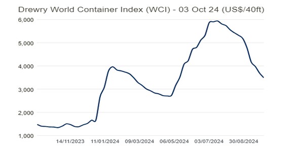 El último índice compuesto WCI de Drewry de 3.489 dólares por contenedor de 40 pies está un 66% por debajo del pico pandémico anterior de 10.377 dólares registrado en septiembre de 2021, pero es un 146% más que la tarifa media de 2019 (prepandémica) de 1.420 dólares.