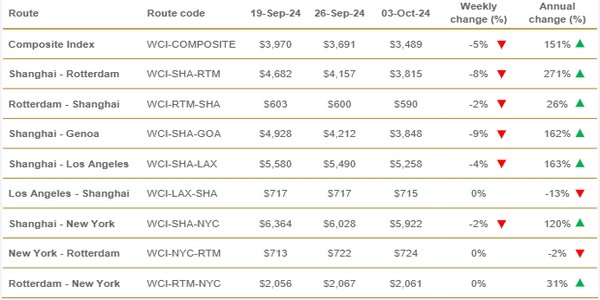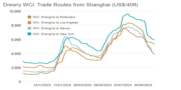 Los fletes de Shanghái a Génova disminuyeron un 9%, o 364 dólares, hasta los 3.848 dólares por contenedor de 40 pies. Del mismo modo, las tarifas de Shanghái a Róterdam bajaron un 8% o 342 dólares a 3.815 dólares por FEU. Asimismo, las tarifas de Shanghái a Los Ángeles descendieron un 4% o 232 dólares hasta los 5.258 dólares por contenedor de 40 pies. Las tarifas de Shanghái a Nueva York y Róterdam a Shanghái cayeron también un 2%, hasta 5.922 y 590 dólares por FEU respectivamente. Mientras tanto, las tarifas de Nueva York a Róterdam, Róterdam a Nueva York y Los Ángeles a Shanghái se mantienen estables. Drewry espera aumentos en las tarifas de China y Europa a la costa este de EE. UU. en las próximas semanas debido a la huelga portuaria del ILA.