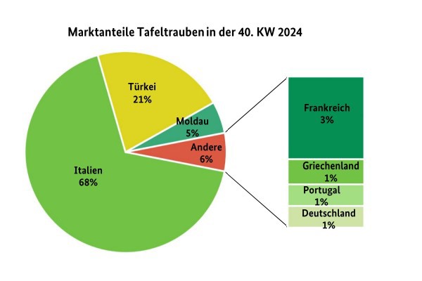 La oferta de uvas italianas fue predominante en el mercado alemán en la semana 40, con muchas variedades Arra e IFG en stock. Italia y Crimson Seedless ganaron un poco de importancia, mientras que Red Globe perdió relevancia. Según BLE, Victoria, que solía marcar la pauta, había desaparecido casi por completo de la venta. De Turquía, las principales variedades fueron Sultana y, en menor medida, Crimson Seedless: ambas variedades se comercializaron sin problemas gracias a una calidad atractiva.