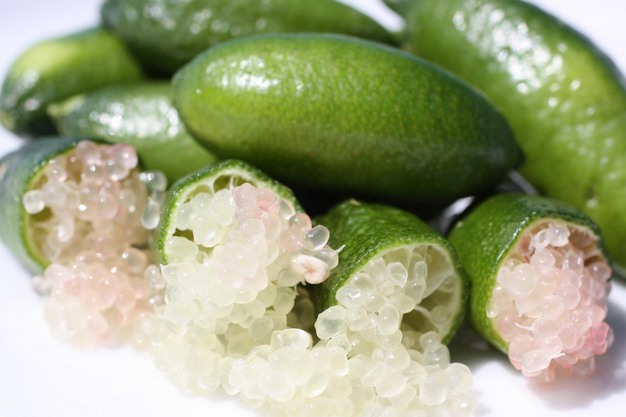 Shanley Farms está cosechando su variedad principal en este momento, un caviar cítrico de color champán, pero también tiene la lima esmeralda, que es de un verde brillante y fluorescente. "Esos árboles producen entre junio y agosto. También tenemos una variedad rojo rubí, Byron Sunrise, que aún no está en producción. Esos árboles están todavía en sus primeros días de vida", dice Shanley Warren.