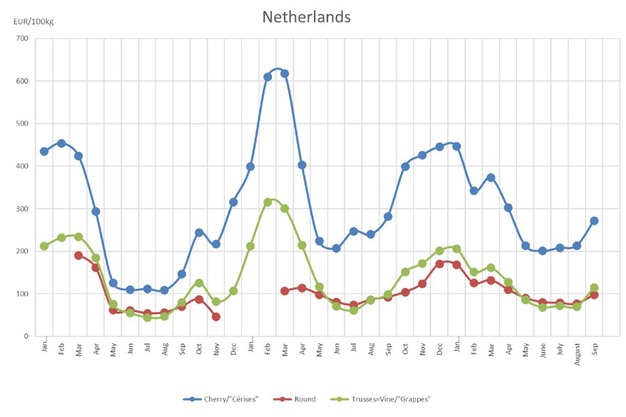 Los precios de los tomates cherry y las especialidades de los Países Bajos también han sido ligeramente inferiores en septiembre que en el mismo mes del año anterior, según los últimos datos oficiales de la Comisión Europea. El precio medio por kilo en este segmento ha sido un 3% más bajo en los Países Bajos en septiembre, situándose en 2,72 euros por kilo. En España, el precio en el segmento del tomate cherry y las especialidades se ha situado en 1,36 euros el kilo, según los estadísticos de la UE.