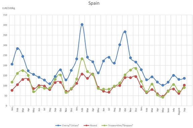 En septiembre, los precios del tomate en España fueron mucho más bajos que el año pasado. El inicio de la temporada para los tomates cherry y las especialidades fue especialmente decepcionante. En cuanto a los tomates en rama de España, los precios han sido inferiores a la media quinquenal.