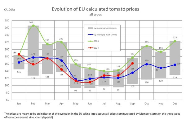 El precio medio de los tomates en la Unión Europea es de 1,61 euros el kilo, lo que lo sitúa a caballo entre la media de los últimos cinco años y el precio récord registrado el pasado mes de septiembre.