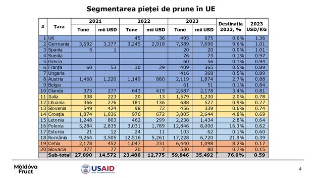 En 2023, el 76% de las exportaciones de ciruelas moldavas se destinaron a la UE y se vendieron a una media de 0,59 €/kg. Destacó Alemania, que se llevó casi el 10% de esas ciruelas, desembolsando 1,01 €/kg. Rusia, Bielorrusia, Kazajistán y Kirguistán representaron juntos el 19%, pagando una media de 0,49 €/kg, mientras que los países balcánicos no pertenecientes a la Unión Europea importaron el 5% de las ciruelas exportadas por Moldavia, pagando una media de 0,41 €/kg. "Hay una dinámica positiva en las exportaciones a la UE, pero no debemos emborracharnos de ella. Todavía hay muchos puntos en los que hay que trabajar duro si queremos realizar una transición de mercado exitosa desde Eurasia a la UE", afirmó el director general.