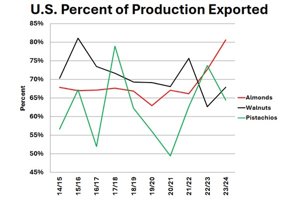 Los productores estadounidenses de almendras, nueces y pistachos dependen en gran medida de los mercados de ultramar. Entre 2014/15 y 2023/24, el porcentaje de producción exportada promedió el 69 por ciento para las almendras, el 71 por ciento para las nueces y el 62 por ciento para los pistachos. En los últimos años, la dependencia de las exportaciones de almendras aumentó debido al aumento de los envíos y la caída de la producción. La dependencia de las exportaciones estadounidenses de nueces alcanzó un máximo del 81% hace casi una década, pero desde entonces ha perdido terreno debido a la creciente competencia de China y Chile. En los últimos años, Estados Unidos se ha convertido en el principal exportador de pistachos, debido a la escasez de suministro de su principal competidor, Irán.