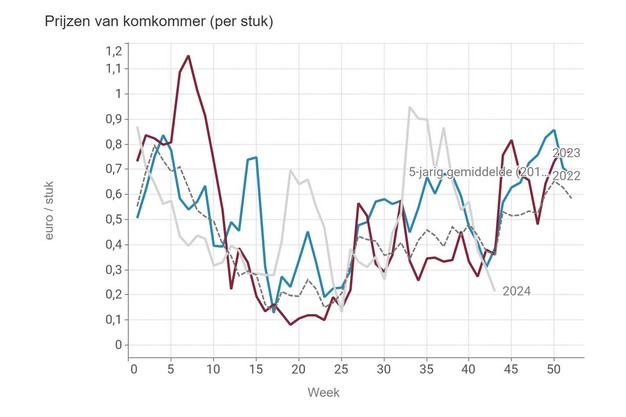 En la semana 43, los precios del tomate en las subastas de la Federación de Cooperativas Hortícolas Belgas (VBT) experimentaron una bajada y estuvieron en línea con la media quinquenal. Tradicionalmente, el cultivo local no iluminado y las importaciones desde los países mediterráneos se solapan. Sin embargo, el precio medio por kilo del tomate en rama se mantuvo en un nivel alto, superior al de los últimos años. En cuanto al pepino, el precio medio de la VBT siguió bajando la semana pasada, situándose muy por debajo de la media de los últimos cinco años.