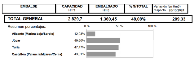 Mientras el mismo día en el que la Comisión de Desembalse hacía este anuncio los embalses de la Confederación Hidrográfica del Júcar se encontraban al 40, 44%, el 4 de noviembre ese total había subido al 48,08%, sumando más de 216 hm³ —209 hm³ de ellos contabilizados en la semana del 28 de octubre al 4 de noviembre—.