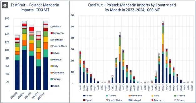 Las importaciones estacionales de mandarinas de Polonia suelen oscilar entre 140.000 y 170.000 toneladas, y se espera que esta temporada alcancen una cifra récord. España sigue siendo el principal proveedor de mandarinas para Polonia, aunque su cuota ha ido disminuyendo. Anteriormente, España representaba el 54-58% de las importaciones de mandarinas de Polonia, pero esta cifra ha disminuido al 40-47% en las dos últimas campañas.