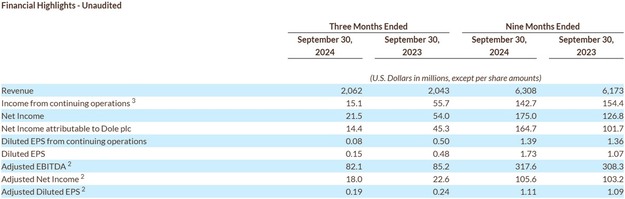 Dole ha informado de los resultados positivos del tercer trimestre para los tres meses finalizados el 30 de septiembre de 2024, lo que la posiciona para un fuerte rendimiento durante todo el año. Los ingresos alcanzaron los 2.100 millones de dólares, lo que refleja un aumento del 1,0%, o del 5,8% en términos comparables. A pesar de un descenso de los ingresos netos a 21,5 millones de dólares, atribuible a una ganancia única de 28,8 millones de dólares por la venta de un activo no esencial en el periodo anterior, la empresa experimentó un crecimiento en las métricas operativas clave. El ebitda ajustado se situó en 82,1 millones de dólares, un 3,7% menos en términos globales pero un 2,3% más en términos comparables. El beneficio neto ajustado fue de 18,0 millones de dólares, con un BPA diluido ajustado de 0,19 dólares. La empresa ha aumentado sus previsiones de ebitda ajustado para todo el año en 10 millones de dólares, con un objetivo de al menos 380 millones de dólares.