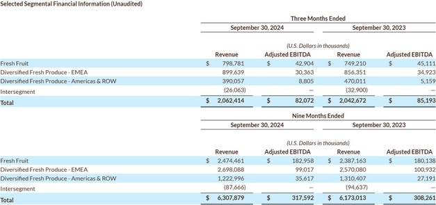 El ebitda ajustado disminuyó un 4,9%, o 2,2 millones de dólares, debido principalmente a los mayores costes de transporte, a los menores volúmenes de piñas vendidas y a la menor rentabilidad de la carga comercial, parcialmente compensados por los mayores volúmenes de bananas vendidas y los mayores precios de bananas y piñas.