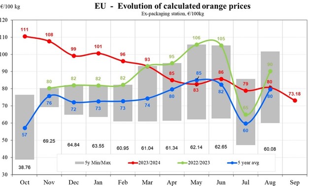 El mercado europeo de cítricos se enfrenta a una importante volatilidad, y los precios de las naranjas experimentan cambios evidentes debido a diversos factores. Según los últimos datos, el precio medio de las naranjas en el conjunto de la UE se situó en 73,18 euros por 100 kg en septiembre de 2024, lo que refleja un descenso del 9,24% en comparación con agosto. El descenso de los precios se atribuye en parte a la fluctuación de la demanda y a las limitaciones de la oferta causadas por las anomalías meteorológicas y la dinámica del mercado.