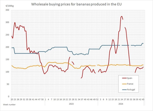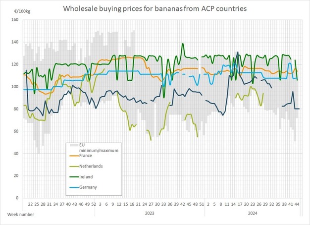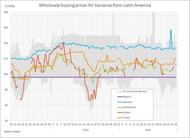 Los últimos datos sobre los precios al por mayor de la banana procedentes de América Latina muestran una variación significativa en los principales mercados europeos. De enero a septiembre, el precio mínimo al por mayor osciló entre 53,20 y 96,20 euros por kilogramo, mientras que el precio máximo fluctuó entre 37,94 y 96,80 euros. Esta amplia horquilla refleja la diversidad de dinámicas de mercado y patrones de demanda en las distintas regiones.