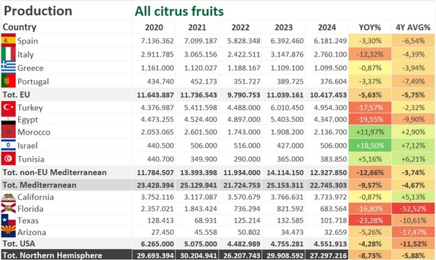 En cuanto a las cifras por países, en España se prevé una producción de 6,18 millones de toneladas, un 3,30% menos que la temporada anterior, con un descenso del 21,01% en limones tras la temporada récord del año pasado. A pesar de los dramáticos fenómenos meteorológicos, la oferta global de España se mantiene estable. Se prevé que la producción de Italia disminuya un 12,32%, hasta situarse en 2,77 millones de toneladas, con un importante retroceso del 17,51% en la producción de naranjas, mientras que Grecia se mantiene estable en 1,09 millones de toneladas. En Turquía, otro país mediterráneo, se prevé que la producción descienda un 17,57% hasta las 4,95 millones de toneladas, volviendo a niveles normales tras las cifras récord de la pasada campaña. En Egipto también se espera una disminución importante, del 19,55%, hasta 4,35 millones de toneladas. Por el contrario, la producción de Marruecos aumentará a 2,14 millones de toneladas, lo que supone un incremento del 11,97%. La producción de Israel también se recuperará, con un incremento estimado del 18,50%, hasta 506.000 toneladas. Portugal, que participa por primera vez en las previsiones, prevé un descenso del 3,37%, hasta las 378.000 toneladas. Por otro lado, se prevé que la producción de Estados Unidos disminuya un 4,28%, hasta 4,55 millones de toneladas, continuando una tendencia a la baja con un descenso del 11,52% en comparación con la media de temporadas anteriores.