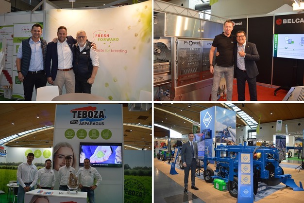Expositores holandeses en expoSE 2024. En el sentido de las agujas del reloj: Ronnie Kersten, de Fresh Forward, entre dos colegas alemanes; Jasper Slaghekke, de Sismatec, con su socio Massimo Bellotti, de Cartonpack; Chris Engels presentando el EcoSpader, y el equipo de Teboza, esta vez sin su director Will Teeuwen, que se puso enfermo y tuvo que volver a casa antes de tiempo.