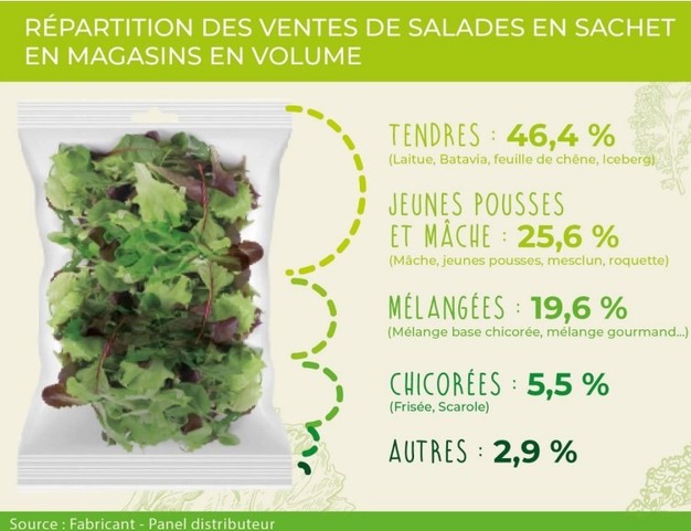 La ensalada ocupa el primer puesto en volumen de ventas. La mayoría de las ensaladas en bolsa vendidas en los comercios son lechugas "blandas", es decir, ensaladas de tipo lechuga: representan actualmente el 46,4% de los volúmenes vendidos en los comercios. Fuente: Fabricante - Panel de distribuidores de 2024.