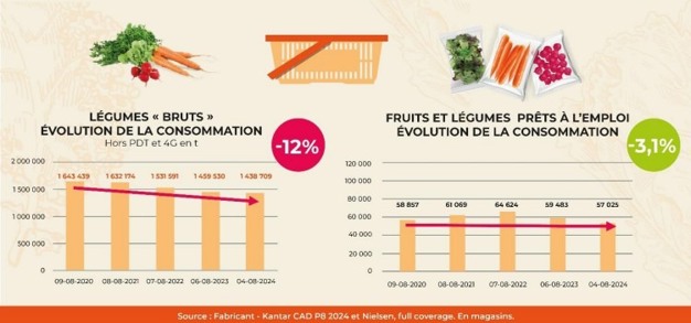 Mientras que las compras de verduras crudas a granel en las tiendas disminuyeron (-12%) en los 8 primeros meses de los últimos 4 años, las compras de verduras listas para el consumo solo perdieron un 3% de sus ventas en el mismo periodo. Más de 7 de cada 10 franceses compran ensaladas y verduras frescas en bolsa (panel Nieslen). El 72% de los franceses compran verduras listas para consumir en las tiendas. Con más de 1 compra al mes, este consumo representa 14 bolsas al año por comprador.