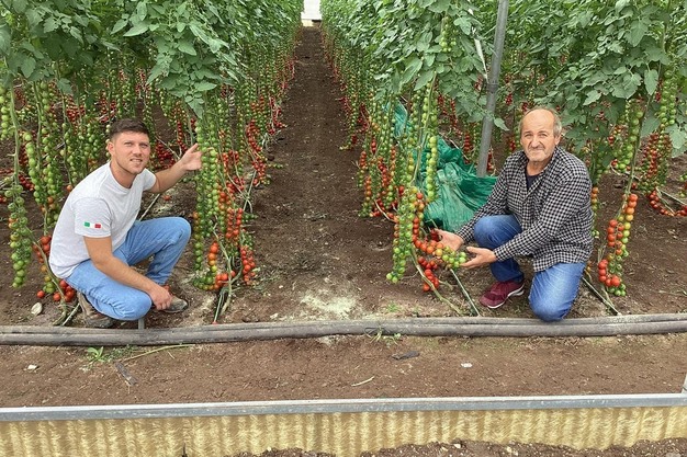 Sebastiano Spadaro (izda.), técnico de Southern Seed, con un productor de tomate.