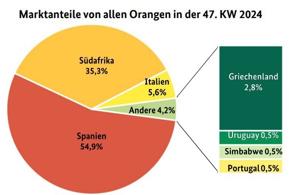 Aunque la presencia de naranjas españolas aumentó significativamente, siguió siendo inferior a la del año anterior. Sobre todo estuvieron disponibles las naranjas Navelina, en varios tamaños. También llegó Newhall de Portugal a Fráncfort, a 2,20 euros el kilo. Así mismo, había fruta sin tratar de Italia, que atrajo bastante atención a pesar de que los precios oscilaban entre 1,80 y 2,40 euros por kilo. Las entregas procedentes de Grecia llegaron exclusivamente a Berlín, donde se comercializaron como naranjas de zumo. Según el BLE, la gama europea ganó así en importancia.
