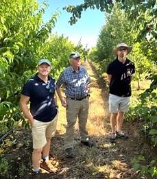 Derecha: En el reciente día de campo de Rubikoo: de izquierda a derecha Pierre Rossouw (Stems Fruit) con Charl Stander (Freshness First) y Stefan du Plessis (Icon Fruit).